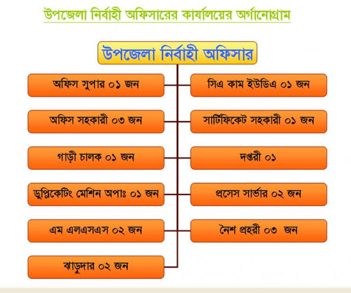 সাংগঠনিক কাঠামো : বাংলাদেশ সরকারের গেজেট অনুযায়ী এ উপজেলায় সাংগঠনিক কাঠামো বিদ্যমান। এ উপজেলায় ০১ জন উপজেলা নির্বাহী কর্মকর্তা, ০১ জন প্রশাসনিক কর্মকর্তা, ২ জন অফিস সহকারী, ০১ জন সার্টিফিকেট সহকারী, ০১ জন জারীকারক, ০১ জন এমএলএসএস, ২ জন নিরাপত্তা প্রহরী ও ০১ জন পরিচ্ছন্নতা কর্মী নিয়োজিত রয়েছে।